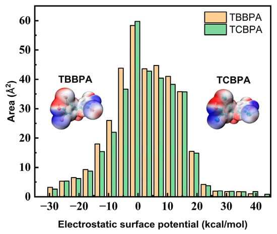 To further analyze the differences in the binding ability between TBBPA and TCBPA with HSA, we employed Multiwfn 3.8 software [48] to calculate and analyze the molecular surface electrostatic potential of these halogen-substituted BPAs. Table 3 and Figure 3 display the calculated results. The different halogen substitutions on BPA structure can impact the distribution and the size of positive and negative surface areas of the electron cloud. Figure 3 illustrates that the negative surface area of TBBPA (157.29 Å2) is larger than that of TCBPA (143.55 Å2). These differences arising from varying halogen substitutions lead to significant alterations in the molecular surface electrostatic potential, indicating that a more stable complex between HSA and TBBPA would be formed if the latter had a higher negative surface area [49]. This finding aligns with the observed increase in Ka values.