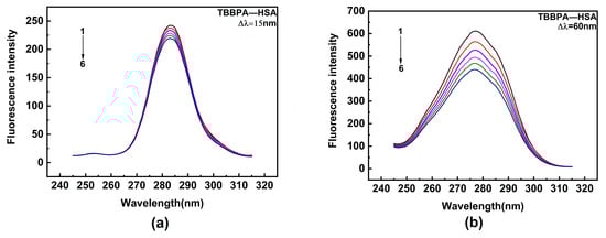 HSA contains two major binding sites for ligand [50]. Among them, site I encompasses Trp and Tyr residues, while site II only contains Tyr residue. Synchronous fluorescence spectroscopy is a highly sensitive and selective technique that provides relevant insights into the interaction of ligands with aromatic amino acids. In the experiment, the monochromators were set for synchronous scans at fixed wavelength differences (∆λ) between the excitation wavelengths (λex) and the measured emission wavelengths (λem). Synchronous fluorescence spectra of Tyr and Trp residues were obtained, with Δλ being 15 and 60 nm, respectively (Δλ = λem − λex). Hence, the effects of TBBPA/TCBPA on Trp and Tyr residues were explored by synchronous fluorescence spectroscopy. Upon the addition of TBBPA/TCBPA, a significant decline in the fluorescence intensity of Trp is observed, while the fluorescence intensity of Tyr experiences a slight decrease (Figure 4). These phenomena indicate that the binding site of HSA with TBBPA/TCBPA is close to Trp [51], and the microenvironment surrounding Trp is influenced by the presence of TBBPA/TCBPA. In summary, TBBPA/TCBPA enters site I and binds to HSA.