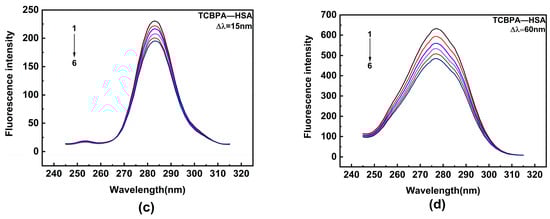 Synchronous fluorescence spectra. (a,b) TBBPA–HSA; (c,d) TCBPA-HSA. Here, [HSA] = 1.0 × 10−6 M; [TCBPA] = 0, 1.5, 3.0, 4.5, 6.0, 7.5 × 10−6 M; [TBBPA] = 0, 1.0, 2.0, 3.0, 4.0, 5.0 × 10−6 M.