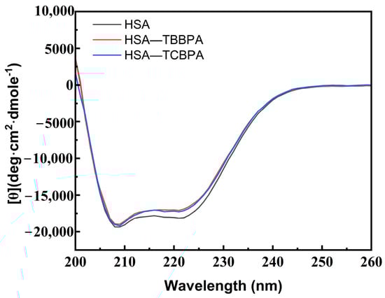 CD spectroscopy can quantitatively analyze the specific changes of protein secondary structure, providing more particular information regarding the conformational changes of HSA upon interaction with TBBPA/TCBPA [10]. HSA displays two negative peaks at 208 nm (π → π*) and 220 nm (n → π*), representing the characteristic α-helical structure of HSA (Figure 6) [57]. The CD peak intensity at 220 nm of HSA undergoes significant changes in the presence of TBBPA/TCBPA (Figure 6), indicating alterations in the spatial conformation of HSA induced by TBBPA/TCBPA and modifications to HSA’s secondary structure [58]. Moreover, the effect of TBBPA on the CD spectrum of HSA is more pronounced compared to TCBPA, revealing a greater impact of TBBPA on HSA conformation.