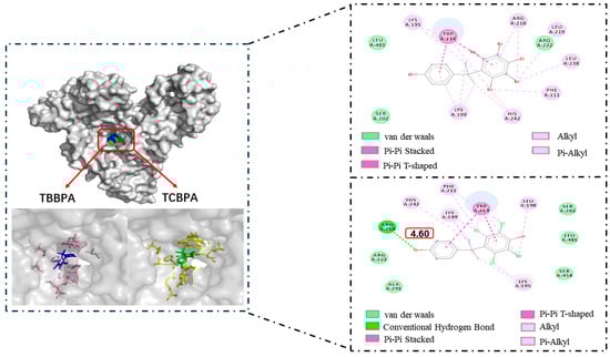 Figure 7 illustrates the optimal docking models of HSA–TBBPA and HSA–TCBPA, where TBBPA/TCBPA is surrounded by numerous residues upon entering the HSA cavity. The π electrons on the phenyl rings of TBBPA and TCBPA are involved in pi–pi interactions with Trp214. This is probably what causes the fluorescence-quenching mechanism of TBBPA/TCBPA in HSA (Trp214 being a major contributor to HSA fluorescence intensity [63]). It is worth noting that TBBPA/TCBPA interacts with residues Lys199, Lys195, Ser202, Phe211, Arg218, Arg222, His242, Leu481, and Trp214. These results suggest that these amino acid residues may play a crucial role in the binding of BPA-like compounds to HSA. Moreover, the halogen substituents on TBBPA and TCBPA engage in pi–alkyl interactions with certain amino acid residues of HSA, indicating the presence of halogen substituents favors the formation of stable complexes between BPA-like compounds and proteins. According to the literature, the Ka value for BPA–HSA is at the level of 103 [23], while the Ka values obtained in this experiment are at the level of 105. Therefore, these data partially support the aforementioned conclusions.
