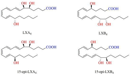 Because of the difference in the conformation, the position of double bonds, and the formation of hydroxyl groups in the molecule, LXs can be classified into four types according to their biosynthetic pathways and the LOs involved in the process, i.e., LXA4, LXB4, and their 15-epimers of 15-epi-LXA4 and 15-epi-LXB4 (Figure 1). LXs have trihydroxyeicosatetraenoic acid in their structure. In addition, 15-epi-LXA4 and 15-epi-LXB4 are aspirin-induced LXs (aspirin-triggered lipoxins, ATLs), which have a more stable conformation and longer half-lives than LXA4 and LXB4 [13,22,23].