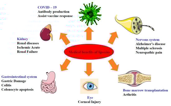 The function of LXs in reducing inflammation in the airway [25], cardiovascular [26], eye and kidney [27], brain [28], obesity [29], periodontal areas [30], gastrointestinal disorders, and liver has been reported. LXs play an important role in the immune regulation process of the body by regulating the immune response through a close connection with a variety of immune cells and immunomodulatory mediators [31]. They can inhibit the expression of pro-inflammatory factors, stimulate the expression of anti-inflammatory factors, inhibit the inflammatory effect of neutrophils, and promote the phagocytosis of apoptotic neutrophils by macrophages. They have good anti-inflammatory effects on the intestine, joints [32,33], lung [34], kidney [35], atherosclerosis [26,36], type II diabetes [37], and epidermal sites, and they also play a positive role in the treatment of COVID-19 as well as in neuroprotection (Figure 2).
