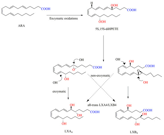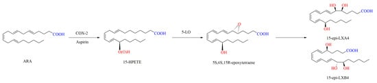 LXs have attracted widespread attention as a class of anti-inflammatory lipid mediators that are produced endogenously by the organism. As bioactive trihydroxyeicosatetraenoic acids, LXs are usually synthesized through the metabolism of arachidonic acid (ARA) in invertebrates and mammals. The formation of LXs can be achieved by cells expressing lipoxygenase (LO), such as leukocytes (mainly polymorphonuclear neutrophils, PMN), platelets, endothelium, and epithelium, via intercellular interactions. The first biosynthetic route of LXs is the sequential oxygenation of ARA by 5-LO in PMN to produce leukotriene LTA4, then to form 5S, 6S, 15S-epoxytetraene by 15-LO in epithelium, and finally to yield LXs. In this route, ARA can also be first transformed to 15S-HPETE by 15-LO alternatively, then to 5S, 6S, 15S-epoxytetraene by 5-LO. The second route of LX biosynthesis involves 5-LO in PMN and 12-LO in platelets. LTA4, derived from ARA by the action of 5-LO, is converted to a delocalized cation by 12-LO and then forms LXs. The third route of LX biosynthesis involves the presence of aspirin, cyclooxygenase-2 (COX-2) in endothelium, and 5-LO in PMN, and therefore the end products are termed aspirin-triggered LXs [10,11,12].