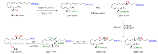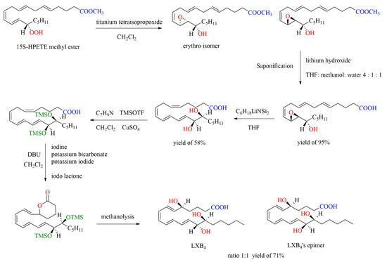 As shown in Figure 7, the chemical synthesis of LXB4 by the iodization method starts with 15S-HPETE methyl ester, which first reacts with titanium tetraisopropoxide in methylene chloride to form threo epoxy alcohol and the erythro isomer in a ratio of 3:1. Sanonification of threo epoxy alcohol with lithium hydroxide in THF–methanol–water and acidification afford hydroxy epoxide, which undergoes sequential reactions and finally gives LXB4 and its isomer [69].