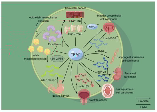 Schematic representation of the mode of action of TPM1 in selected cancers. TPM1 has been confirmed to play a role in a variety of cancers, including kidney cancer, oral cancer, bladder cancer, and gastric cancer. Among them, it is closely related to the miRNA family. For example, TPM1 is negatively correlated with miR-21 and miR-183, and it is positively correlated with miR-96, thereby affecting the occurrence and development of related cancers. On this basis, TPM1 is also closely related to EMT and acts as a tumor suppressor to some extent.