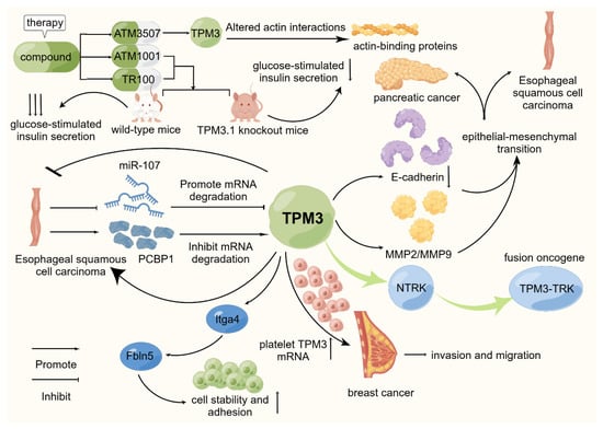 Schematic representation of the mode of action of TPM3 in selected cancers. TPM3 is widely recognized as an oncogenic factor in existing studies. It is actively involved in promoting the proliferation, invasion, migration, and other biological behaviors of various cancers. On this basis, TPM3-TRK, as a fusion oncogene, is currently a hot topic in related research fields. Through existing studies, TPM3 has been confirmed to be involved in the occurrence and development of esophageal squamous cell carcinoma, breast cancer, and other tumors. At the same time, some scholars have studied related targeted drugs and achieved good results.