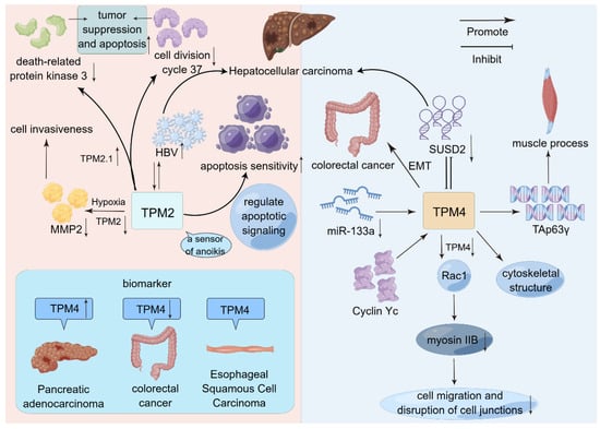 In conclusion, Tpm is more involved in the invasion and migration of tumor tissues and has been studied mainly in tumor tissues, such as esophageal cancer and liver cancer. Meanwhile, the activities of Tpm in cancer are closely related to miRNAs and LncRNAs and are associated with epithelial–mesenchymal transition and apoptosis, etc. TPM is more often regulated as a downstream gene of oncogenes and can be regarded as a “dependent variable” of cancer development, while TPM3 is more specific and often appears as an oncogene. TPM3 is distinctive and often appears as an oncogene from the perspective of researchers. In general, the specific mechanism of Tpm in cancer is not clear, which will be an important direction for future Tpm research.