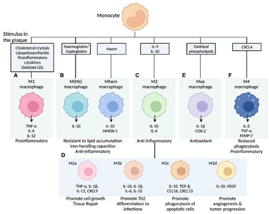 Macrophage subpopulations in atherosclerotic lesions. Stimuli present in atherosclerotic lesions drive the differentiation of monocytes towards different macrophage phenotypes. (A) M1 macrophages release pro-inflammatory cytokines; (B) M (Hb)/Mhem are associated with intraplaque hemorrhage; (C) M2 macrophages are anti-inflammatory and are less capable of lipid accumulation; (D) M2 is further categorized into four subtypes by activating molecules; (E) Mox macrophages are induced by oxidized phospholipids and increase the expression of antioxidant enzymes to protect oxidative stress; and (F) M4 macrophages express pro-inflammatory cytokines and have impaired phagocytic function. COX-2 = cyclooxygenase-2, CXCL4 = C-X-C motif chemokine 4, HMOX-1 = haem oxygenase (decycling) 1, LDL = low-density lipoprotein, LXR = liver X receptor, MMP-7 = matrix metalloproteinase-7, NFE2L2 = nuclear factor (erythroid-derived 2)-like 2, NF-κB = nuclear factor kappa-light-chain-enhancer of activated B cells, TLR = toll-like receptor, TNF = tumor necrosis factor. Modified permission obtained from Chinetti-Gbaguidi G. et al., Nat Rev Cardiol 2015 [59] and Kawai K. et al., Expert Rev Cardiovasc Ther 2022 [60].