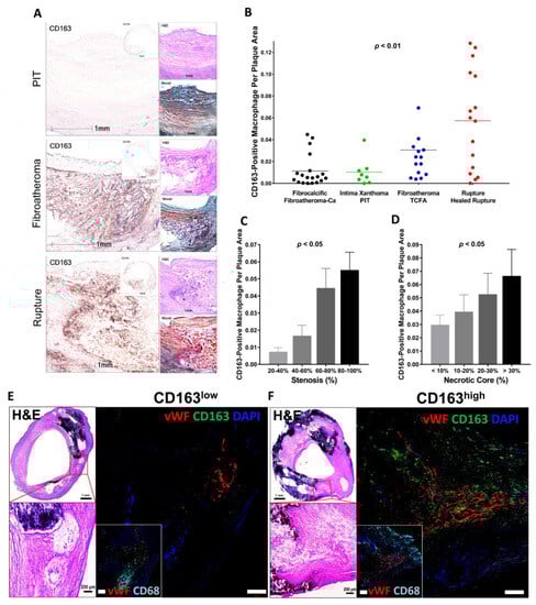 CD163+ macrophages are associated with progression of carotid atherosclerosis in humans. (A) Representative images of human carotid arteries with PIT, fibroatheroma and ruptured atherosclerotic plaques. High-magnification immunohistochemistry images of CD163 with low-magnification insets. H&E and Movat pentachrome stains are also shown. Scale bars: 1 mm and 5 mm (insets). (B–D) Correlation between CD163+ macrophages and human carotid plaque progression. (B) Human carotid plaques were classified as fibrocalcific or fibroatheroma with calcification (Fibroatheroma-Ca) (n = 19, black); intima xanthoma or PIT (n = 8, green); fibroatheroma or TCFA (n = 14, blue); and ruptured or healed rupture (n = 16, red), with the corresponding percentage of CD163+ macrophages per plaque area. (C) Correlation between CD163+ macrophages and the percentage of stenosis. The percentage of stenosis was categorized as follows: 20–40% (n = 5), 40–60% (n = 14), 60–80% (n = 23), and 80–100% (n = 28). (D) Correlation between CD163+ macrophages and the percentage of necrotic core area. The percentage of necrotic core area was classified as: <10% (n = 32), 10–20% (n = 19), 20–30% (n = 9), and >30% (n = 10). (E,F) Human plaques obtained by carotid endarterectomy were examined by histology and immunofluorescence. Images were acquired by confocal microscopy (E,F). In (E), as explained in the text, areas from fibroatheroma lesions containing foam cell (CD163− [green], CD68+ [cyan]) macrophages (i.e., low CD163) and M (Hb) macrophages (CD163+, CD68+ [i.e., high CD163]) were immunostained using antibodies against vWF antigen for detection of microvessels. Nuclei were counterstained using DAPI (blue). Note that calcification is seen as dense areas of dark purple. Adjacent low- and high-magnification images of H&E-stained sections show the corresponding regions of angiogenesis. Scale bars: 1 mm and 200 μm. Results are presented as the mean or the mean ± SEM. For multiple group comparisons, 1-way ANOVA was used. p values shown in (B–D) were determined by 1-way ANOVA. Permission obtained from Guo L. et al., J. Clin. Invest. 2018 [67].