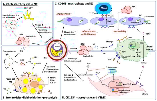 Schematic representation for current understanding of IPH on high-risk plaque development. At the site of IPH, accumulation of free cholesterol in the necrotic core due to erythrocyte membrane deposition (A), lipoprotein oxidation by ROS caused by biological reaction of free iron released from free hemoglobin (B) and inflammatory response of CD163+ macrophages to hemoglobin released from erythrocytes interacting with ECs (C) and VSMCs (D), synergistically contribute to increase necrotic core size, fragility of the plaque, and may result in further cardiovascular complications. CC = cholesterol crystal, CD = cluster differentiation, EC = vascular endothelial cell, FC = fibrous cap, FPN = ferroportin, HAS1 = hyaluronan synthase 1, Hb = hemoglobin, Hep = hepcidin, HIF1a = hypoxia inducible factor 1 alpha, Hp = haptoglobin, IL-6 = interleukin 6, LDL = low density lipoprotein, LOX1 = lectin-like oxidized LDL receptor 1, LPS = lipopolysaccharide, NFκB = nuclear factor kappa B, oxLDL = oxidized LDL, MMP = matrix metalloproteinase, Mono = monocyte, NC = necrotic core, PHD2 = prolyl hydroxylase domain-containing protein 2, RBC = red blood cell, ROS = reactive oxygen species, RUNX2 = runt-related transcription factor 2, TLR4 = toll-like receptor 4, TNFα = tumor necrosis factor alpha, VCAM1 = vascular cell adhesion molecule 1, VE-cad = vascular endothelial cadherin, VEGF = vascular endothelial growth factor, VEGFR2 = VEGF receptor 2, VLA4 = very late antigen 4, VSMC = vascular smooth muscle cell. Modified permission obtained from Guo L. et al., J. Clin. Invest. 2018 [67], and Sakamoto, A. et al., JCI insight 2023 [68].