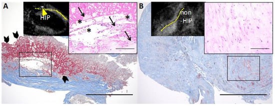 Representative histological images of HIP and non-HIP lesions in the coronary plaque detected by cardiac MRI. (A) Non-contrast T1-weighted magnetic resonance imaging (T1WI) shows high-intensity plaque (HIP) (plaque-to-myocardium signal intensity ratio (PMR) = 4.42, yellow arrowhead; the yellow dotted line indicates the coronary artery). The HIP lesion contains fibrous tissue with abundant atheroma components, such as cholesterin crystals (solid asterisks) and foamy macrophages (solid arrows) with red blood cells. (A) A large amount of fibrin deposition (solid arrowheads) is seen adjacent to the atheroma components. (B) Noncontrast T1WI shows non-HIP (PMR = 0.97). The non-HIP lesion demonstrates fibrous connective tissue. Low-power images of Masson’s trichrome stain (scale bars: 500 μm) and high-power images of hematoxylin and eosin stain (insets, scale bars: 100 μm). Permission obtained from Uzu K. et al., JACC Cardiovasc Imaging 2021 [11].