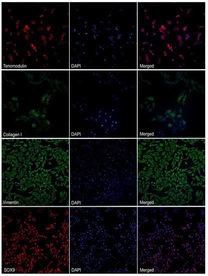 Fluorescent images of tenocytes immunolabeled with tenomodulin (red) (200× magnification), collagen 1 (green) (400× magnification), vimentin (green) (200× magnification), and SOX9 (red) (200× magnification). Nuclear counterstaining was performed with DAPI (blue).