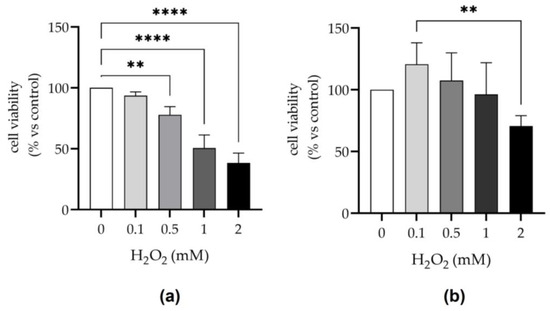 To determine the effects of H2O2 and PRP on cell viability, tenocytes were exposed to increasing doses of H2O2 (0, 0.1, 0.5, 1, 2 mM) in medium supplemented with 10% fetal bovine serum (FBS) or 10% PRP for 24 h. As shown in Figure 2, H2O2 induces a significant dose-dependent decrease in cell viability of tenocytes cultivated in medium supplemented with FBS (p < 0.01; p < 0.0001). Otherwise, the replacement of FBS with PRP protected cells from H2O2 effects. In this condition, cells exposed to 0.1–1 mM of H2O2 showed a cell viability similar to or higher than those observed in the cell control. The lowest cell viability was observed in PRP medium only at very high H2O2 concentrations, i.e., 2 mM, compared to controls, even if not statistically significant. Remarkably, the same concentration of H2O2 (2 mM) induced an approximately 60% decrease in cell viability in medium with FBS.