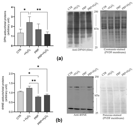 To test the antioxidant effects of PRP, tenocytes were exposed to H2O2 (1 mM) in medium with FBS (CTR) or PRP (10%) for 24 h, and the oxidative damage of proteins was evaluated. This concentration of H2O2 was chosen based on previous results, as it induced significant cell death that is reduced by PRP. In particular, the levels of protein carbonylation as 2,4-dinitrophenylhydrazine (DNP)-protein adducts and the levels of 4-Hydroxynonenal (4-HNE)-protein adducts were measured. A significant increase (p < 0.05) in protein carbonylation was observed in the tenocytes exposed to H2O2 in medium supplemented with FBS with respect to the controls (Figure 3a). Moreover, no significant changes were observed by comparing the levels of carbonylated protein in control cells and tenocytes exposed in PRP medium with or without H2O2 (Figure 3a). The results proved that PRP counteracts the carbonylation of proteins as the levels of DNP-protein adducts treated in cells with H2O2 in PRP medium are significantly lower than those treated with FBS medium (Figure 3b).