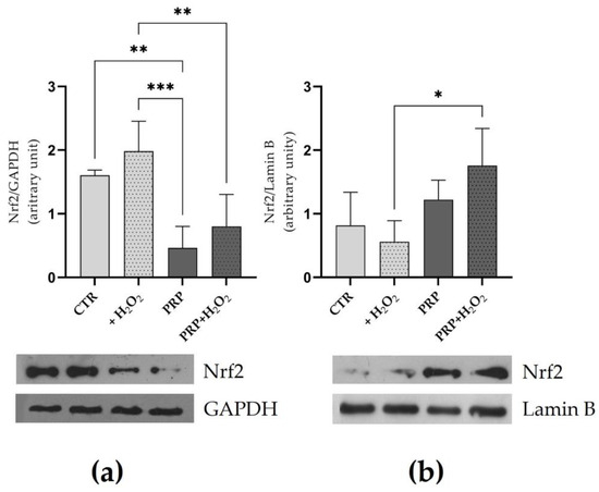 To investigate the putative effect of PRP on the activation of Nrf2 signaling in tenocytes, the cytosolic and nuclear levels of this transcription factor were analyzed. As shown in Figure 4, PRP can induce Nrf2 nuclear translocation in pro-oxidizing conditions. In fact, PRP significantly reduced the cytosolic levels of Nrf2 in tenocytes either in the absence or in the presence of H2O2. On the contrary, the nuclear levels of Nrf2 increased in cells exposed to the H2O2 in medium with PRP.