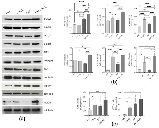 To verify if the nuclear migration of Nrf2 induced by PRP can result in the modulation of tenocytes antioxidant response, the levels of antioxidant/phase II detoxifying enzymes were investigated. The results (Figure 5a) showed that in tenocytes exposed to H2O2, the levels of catalase (CAT) and glutathione S-transferase (GSTP) significantly increased both in the presence and in the absence of PRP. The supplementation of the medium with PRP also induced a significant increase in both proteins. Furthermore, tenocytes were able to respond to the oxidative insult by significantly increasing the levels of NAD(P)H oxidoreductase quinone-1 (NQO1) and glutamate cysteine ligase catalytic subunit (GCLC) even if to a lesser extent than when PRP is present in the medium together with H2O2. PRP up-regulates superoxide dismutase 2 (SOD2) expression both in the presence and in the absence of H2O2, while inducing a statistically significant increase in heme oxygenase 1 (HO-1) levels only in tenocytes in co-presence of H2O2. In the presence of H2O2, the enzymatic activities of Glutathione Transferase (GST) and CAT were significantly increased compared to the control (Figure 5b). This effect was enhanced by the presence of PRP in the medium.