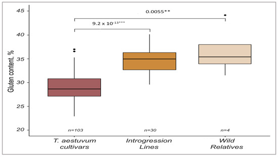 - Mohamed, I.E.S.; Kamal, N.M.; Mustafa, H.M.; Abdalla, M.G.A.; Elhashimi, A.M.A.; Gorafi, Y.S.A.; Tahir, I.S.A.; Tsujimoto, H.; Tanaka, H. Identification of Glu-D1 alleles and novel marker–trait associations for flour quality and grain yield traits under heat-stress environments in wheat lines derived from diverse accessions of Aegilops tauschii. Int. J. Mol. Sci. 2022, 23, 12034. [Google Scholar] [CrossRef] [PubMed]