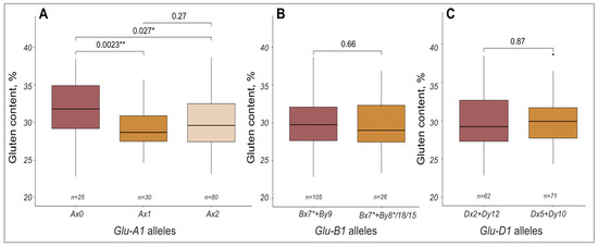 - Butow, B.J.; Ma, W.; Gale, K.R.; Cornish, G.B.; Rampling, L.; Larroque, O.; Morell, M.K.; Békés, F. Molecular discrimination of Bx7 alleles demonstrates that a highly expressed high-molecular-weight glutenin allele has a major impact on wheat flour dough strength. Theor. Appl. Genet. 2003, 107, 1524–1532. [Google Scholar] [CrossRef]