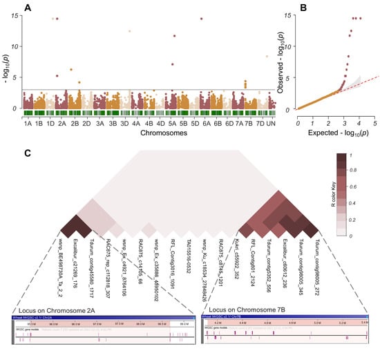 | RFL_Contig801_2124 | 7B | 3,848,916 | 4,175,664 | 10.06 | 1.73 × 10−4 | T/C | 9.18 | 0.77 |