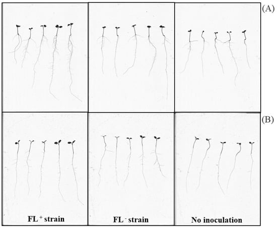 Kale (Brassica oleracea var. acephala ‘Dwarf Green Curled’) and lettuce (Lactuca sativa ‘Simpson’) seeds were purchased from Halifax Seeds (Halifax, NS, Canada). S. meliloti strains (FL+, FL−) were grown for 5 days in MMNH4 medium plates. Cultures were scrubbed and suspended in sterile water to prepare bacterial solutions with an OD600 of 0.6. The lettuce and kale seeds were sterilized with 10% sodium hypochlorite for 10 min and washed thoroughly three times with sterile distilled water (ddH2O). The cleaned seeds were treated by soaking in solutions of FL+, FL−, and sterile ddH2O, which was the control treatment, for 90 min. The treated seeds were air-dried under a laminar flow for 30 min. Ten seeds per treatment were placed in a 16.5 × 18 cm CYG germination pouch (Mega International, Roseville, MN, USA) with six biological replicates, and saturated with 25 mL of the respective solution per seed treatment.