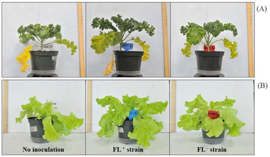 Kale plants were not significantly (p > 0.05) different in the number of leaves, plant height, and stem diameter between FL+ inoculated plants (FL+ plants) and FL− inoculated plants (FL− plants). However, the plant height and stem diameter were higher in FL+ plants than in the FL− plants and control plants (Table S1; Figure 2). Stem diameter was increased by 10% in FL+ plants than in FL− plants (Table S1). The kale leaf elongation rate was also higher in FL+ plants compared to the FL− and control plants (Figure S1). Our results showed a significant (p < 0.05) difference in the stem diameter of kale between the FL+ plants and no inoculation controls (Table S1). Chlorophyll fluorescence indices, Fv/Fo, and Fv/Fm were enhanced by bacterial-derived FLs (Table S1). The results showed Fv/Fo and Fv/Fm were slightly increased in FL+ plants compared to the FL− plants, even though there was no significant difference (p > 0.05) between treatments (Table S1). Moreover, the fresh weight of kale was increased by 7% in FL+ plants compared to FL− plants (Table S1).