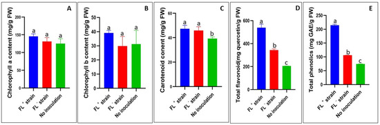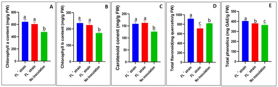 In kale leaves, chlorophyll a and b and carotenoid content in the leaves were significantly (p < 0.05) increased in bacteria-inoculated plants compared to control plants, although they were not significantly (p > 0.05) different between FL+ and FL− kale plants (Figure 3A–C). FL+ plants showed that chlorophylls a and b, and carotenoid contents were 35%, 35%, and 26% increased, respectively, compared to the control plants (Figure 3A–C). Similarly, chlorophylls a and b were higher in FL+ plants than FL− kale plants (Figure 3A–C). The total flavonoid content in kale leaves was significantly (p < 0.05) higher in FL+ plants by 28% and 12% more than in the FL− and control plants, respectively (Figure 3D). The leaves of the FL+ plants had significantly (p < 0.05) higher total phenolic content than the FL− and control plants (Figure 3E).