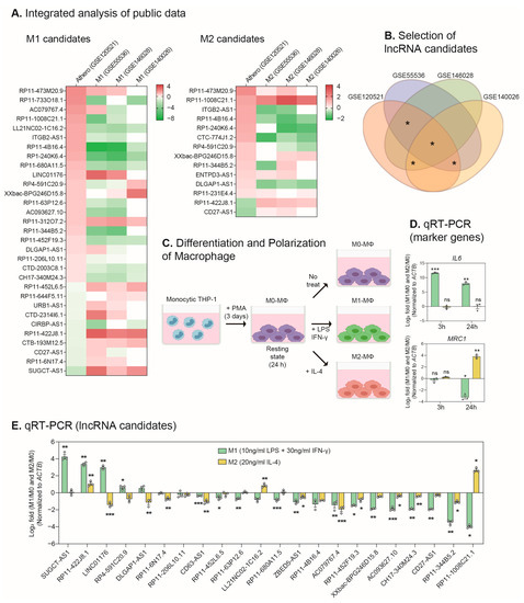 Identification of lncRNA candidates through integrative transcriptome analysis and experimental validation. (A) Comprehensive analysis of expression profiles of lncRNA candidates during atherosclerosis progression and macrophage activation (M1 and M2 macrophages). The criteria for the selection of differentially expressed lncRNAs are described in the Section 4. (B) The combination of atherosclerosis data and three macrophage datasets is shown as a Venn diagram. Candidates for lncRNAs that showed significant expression patterns at the intersections (asterisks) between the datasets were selected. (C) The processes of differentiation from human monocytic THP-1 cells into M0 macrophages and polarization into M1 or M2 macrophages. Monocytic THP-1 cells were cultured with PMA (100 nM) for three days. After resting for one day, M1 (10 ng/mL LPS and 30 ng/mL IFN-γ) or M2 (20 ng/mL IL-4) stimulation was administered. (D) qRT-PCR measurement of the expression of pro- and anti-inflammatory genes (IL6 and MRC1) in M1 and M2 macrophages activated for 3 and 24 h (n = 3). (E) qRT-PCR measurement of the expression of lncRNA candidates in M1 and M2 macrophages activated for 24 h (n = 3). The expression of inflammatory genes and lncRNAs was normalized to ACTB. The circles in the bars indicate each data point. Data are presented as mean ± SEM. An unpaired two-tailed t-test with Welch’s correction was used for statistical analysis. * p < 0.05, ** p < 0.01, *** p < 0.005, ns: not significant.