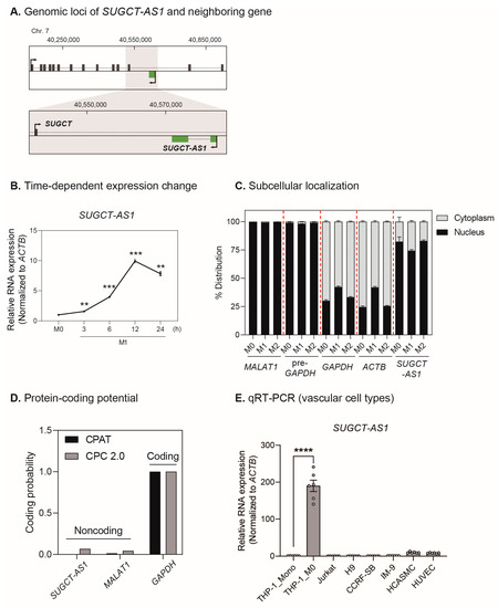 Characterization of SUGCT-AS1 involved in the differentiation and polarization of macrophages. (A) Genomic loci of lncRNA SUGCT-AS1 and its neighboring protein-coding gene SUGCT in the human genome (GRCh37/hg19). The genomic information was obtained from the UCSC Genome Browser. (B) qRT-PCR measurement of SUGCT-AS1 in THP-1-derived macrophages administered with M1 stimuli (10 ng/mL LPS and 30 ng/mL IFN-γ) at different treatment times (n = 3). (C) Subcellular localization of SUGCT-AS1 in THP-1-derived macrophages of each subtype (n = 3). MALAT1 and pre-GAPDH were used as controls for nuclear RNA, and ACTB and GAPDH were used as controls for cytoplasmic RNA. (D) The protein-coding potential of SUGCT-AS1. The coding probability of SUGCT-AS1 was assessed by CPAT and CPC 2.0 tools. MALAT1 was used as a control for the non-coding RNA, and GAPDH was used as a control for the protein-coding RNA. (E) qRT-PCR measurement of vascular cell type-specific expression of SUGCT-AS1 (n = 6). The circles in the bars indicate each data point. THP-1_mono: monocytic THP-1 cells, THP-1_M0: THP-1-derived macrophages, Jurkat and H9: T-cell lines, IM-9 and CCRF-SB: B-cell lines, HCASMCs: human coronary artery smooth muscle cells, HUVECs: human umbilical vein endothelial cells. The RNA expression was normalized to ACTB (B,E). Data are presented as mean ± SEM. An unpaired two-tailed t-test with Welch’s correction was used for statistical analysis. ** p < 0.01, *** p < 0.005, **** p < 0.001.