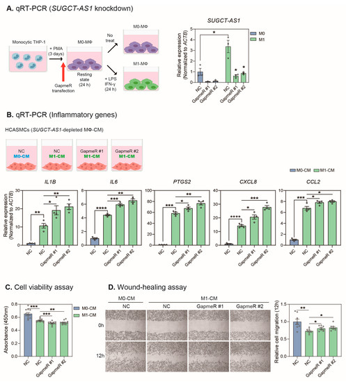 Effect of conditioned media of SUGCT-AS1-depleted THP-1 cells on phenotypic changes in vascular smooth muscle cells. (A) Experimental design for SUGCT-AS1 knockdown in M0 and M1 macrophages. Following 24 h of GapmeR transfection, M1 stimulation was performed for 24 h, and depletion of SUGCT-AS1 was confirmed by qRT-PCR (n = 3). NC: negative control GapmeR. (B) Top: Conditioned media (CM) of THP-1-derived macrophages (M0 and M1) transfected with GapmeRs (NC, GapmeR #1, and #2) were treated with HCASMCs. Bottom: qRT-PCR measurement of inflammatory genes (IL1B, IL6, PTGS2, CXCL8, and CCL2) in HCASMCs after 24 h of CM treatment (n = 4). The RNA expression was normalized to ACTB. (C) Cell viability assay in HCASMCs after 24 h of CM treatment (n = 12 for each of the transfected samples merged from 3 independent experiments). (D) Wound-healing assay in HCASMCs after 0 to 12 h of CM treatment (n = 8). The circles in the bars indicate each data point. Data are presented as mean ± SEM. An unpaired two-tailed t-test with Welch’s correction was used for statistical analysis. * p < 0.05, ** p < 0.01, *** p < 0.005, **** p < 0.001.