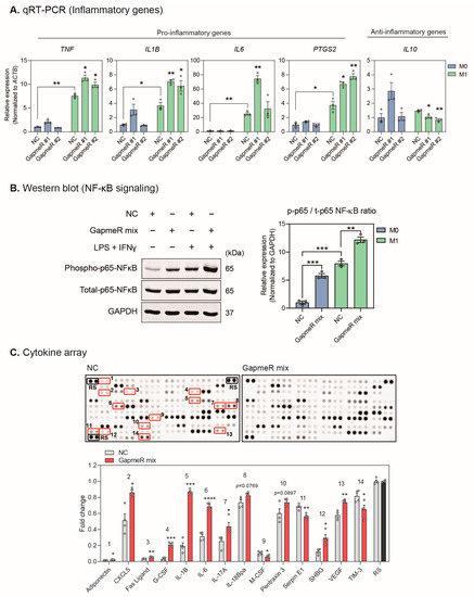 Effect of SUGCT-AS1 knockdown on proinflammatory cytokine release. (A) qRT-PCR measurement of pro- and anti-inflammatory genes (TNF, IL1B, IL6, PTGS2, and IL10) in THP-1-derived macrophages (M0 and M1) transfected with GapmeRs (NC, GapmeR #1, and #2) (n = 3). M1 stimulation was treated for 24 h. The RNA expression was normalized to ACTB. (B) Western blot analysis of NF-κB p65 activation in THP-1-derived macrophages (M0 and M1) transfected with GapmeRs (NC and GapmeR mix) (n = 3). M1 stimulation was performed for 30 min. The ratio of phosphorylated p65 to total p65 was determined (phospho-p65/t-p65 ratio). The GapmeR mix is a mixture of GapmeR #1 and #2. The protein expression was normalized to GAPDH. (C) Human cytokine array in conditioned media (CM) of THP-1-derived M1 macrophages transfected with GapmeRs (NC or GapmeR mix). M1 stimulation was treated for 24 h. The differentially measured spots for cytokines and chemokines are labeled with Arabic numerals and red boxes between NC and GapmeR mix (n = 4 cultures per group). Each spot was normalized to reference spots (RS). The circles in the bars indicate each data point. Data are presented as mean ± SEM. An unpaired two-tailed t-test with Welch’s correction was used for statistical analysis. * p < 0.05, ** p < 0.01, *** p < 0.005, **** p < 0.001.