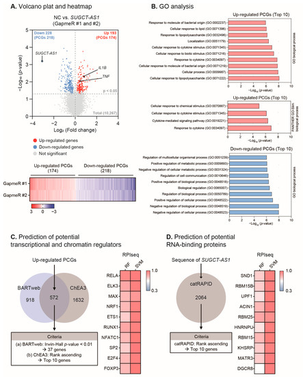 Transcriptomic and bioinformatic analysis of SUGCT-AS1-depleted cells. (A) Differentially expressed genes in response to SUGCT-AS1 knockdown in THP-1-derived M1 macrophages stimulated for 24 h. For those genes with statistically significant expression change (p-value < 0.05) in the GapmeR-treated samples compared to the control-treated (NC) sample, and those with common expression changes in both GapmeRs (GapmeR #1 and #2), the upregulated genes were indicated with red dots, while downregulated genes were indicated with blue dots, respectively. Note that the gray dots above the p-value = 0.05 line represent those genes whose expression change is significant only in one of the two GapmeR-treated samples. (B) The Gene Ontology (GO) analysis of differentially expressed protein-coding genes (PCGs) from the gene sets in (A). (Top and Middle: analysis for 174 upregulated PCGs; Bottom: analysis for 218 downregulated PCGs). Based on the false discovery rate (FDR) q-value, up to the top 10 GO terms were shown. (C) Prediction of potential transcriptional and chromatin regulators regulating the transcription of PCGs upregulated by SUGCT-AS1 depletion from RNA-seq data. Left: Based on BARTweb’s Irwin–Hall p-value and ChEA3′s rank, 37 common proteins were selected. Right: The probability of interaction between SUGCT-AS1 and the top 10 common proteins among these 37 was predicted by RPIseq. The heatmap represents interaction scores from 0 to 1 (RF: random forest, SVM: support vector forest). (D) Prediction of potential RNA-binding proteins (RBPs) capable of binding to SUGCT-AS1. Left: based on catRAPID’s rank, the top 10 RBPs were selected. Right: the probability of interaction between SUGCT-AS1 and the top 10 RBPs was predicted by RPIseq.