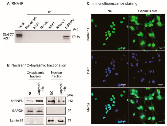 To elucidate how SUGCT-AS1 functions with hnRNPU, we first investigated whether the expression of hnRNPU was altered. However, changes in the mRNA level of hnRNPU were not confirmed in our SUGCT-AS1-depleted RNA-seq data (Figure S17A). Its protein level also did not change in SUGCT-AS1-depleted Western blot analysis (Figure S17B). Previous reports have shown that most hnRNPs are present in the nucleus, but some are known to translocate between the nucleus and the cytoplasm [37,38]. To investigate the role of SUGCT-AS1 on the intracellular distribution of hnRNPU, we fractionated THP-1-derived M0 macrophages treated with GapmeRs into the nucleus and cytoplasm. Strikingly, we confirmed that a large fraction of hnRNPU proteins in the nucleus were translocated to the cytoplasm following SUGCT-AS1 depletion (Figure 6B). In addition, this result was verified through immunofluorescence staining using the hnRNPU antibody (Figure 6C). However, even after GapmeR treatment against SUGCT-AS1, the amount of hnRNPU proteins remaining in the nucleus was high, suggesting that it may also be regulated by factors other than SUGCT-AS1.
