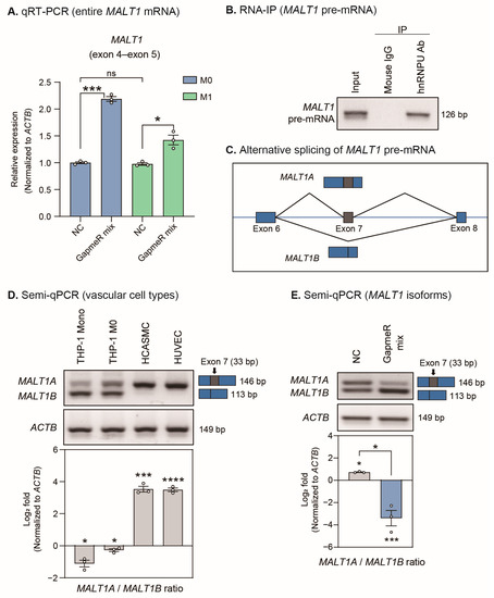 A recent study reported that alternative splicing of mucosa-associated lymphoid tissue lymphoma translocation protein 1 (MALT1) is regulated by hnRNPU in T cells [39]. We also noted that MALT1 regulates the activation of NF-κB signaling [40]. Based on these studies, we investigated whether the change in the nuclear-cytoplasmic distribution of hnRNPU by SUGCT-AS1 regulated the alternative splicing of MALT1 in macrophages. Interestingly, when our previous vascular smooth muscle cell RNA-seq data and human macrophage public data (GSE101868) were visualized using the sashimi plot of the integrative genomics viewer (IGV) genome browser, exon 7 exclusion of MALT1 was observed only in macrophages (Figure S18) [41,42,43]. To test the role of SUGCT-AS1 in the regulation of MALT1 splicing, we first designed a PCR primer set (detecting exon 4–exon 5 regions) that can measure both isoforms; from this, we found that the expression of entire MALT1 mRNA was increased when SUGCT-AS1 was depleted in both the M0 and M1 macrophages (Figure 7A). From the RIP experiment, it was verified that MALT1 pre-mRNA (intron 6–exon 7–intron 7 region is detected) binds to hnRNPU in the cells that we tested (Figure 7B and Figure S19). Next, we used semi-qPCR to identify the two transcript isoforms of MALT1 (MALT1A and MALT1B) produced by alternative splicing (Figure 7C). MALT1A was highly expressed in vascular smooth muscle cells and vascular endothelial cells, and MALT1B was highly expressed in monocytic THP-1 and M0 macrophages (Figure 7D). These results indicate that alternative splicing of MALT1 occurs differently in each vascular cell type. Interestingly, when SUGCT-AS1 was depleted in THP-1-derived M0 macrophages, the proportion of MALT1B was markedly increased (Figure 7E). Conversely, when SUGCT-AS1 was overexpressed in THP-1 cells, the MALTA isoform was increased and the expression of proinflammatory genes was also decreased (Figure S20A,B). Importantly, a recent study showed that selective disruption of the MALT1B isoform led to the suppression of NF-κB activation and manifested in severe immunopathology as a symptom of autoimmunity [44]. Overall, our findings suggest that SUGCT-AS1 depletion induces a change in the intracellular distribution of hnRNPU, thereby affecting the alternative splicing of MALT1, which in turn regulates NF-κB signaling in macrophages.