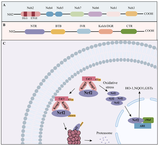 The structural architecture of Nrf2 and Keap1, and the Nrf2/Keap1 pathway. (A) Nrf2 consists of seven domains. (B) Keap1 contains five domains. (C) Under basal conditions, Nrf2 is bound with Keap1 and degraded in the cytosol. Under oxidative stress conditions, free Nrf2 is promoted and translocates into the nucleus and promotes the expression of downstream antioxidant genes. Some of the material in the image was sourced from BioRender.com, accessed on 24 July 2023. The black line in Figure 1C represents promotion. antioxidant response element: ARE; Kelch-like ECH-associated protein 1: Keap1; nuclear factor erythroid 2-related factor 2: Nrf2; small musculoaponeurotic fibrosarcoma: sMAF; heme oxygenase 1: HO-1; NADP (H) quinone dehydrogenase 1: NQO1; glutathione-S-transferases: GSTs.