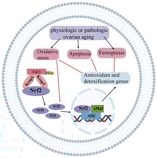 The role of the Nrf2 signaling pathway in ovarian aging. When exposed to oxidative stress, the Nrf2 pathway is active to protect against oxidative stress damage under basal conditions. However, oxidative stress increases during ovarian aging, but the Nrf2 pathway is inhibited, so apoptosis and ferroptosis increase. Some of the material in the image was sourced from BioRender.com, accessed on 20 August 2023. The red line represents inhibition and the black line represents promotion.