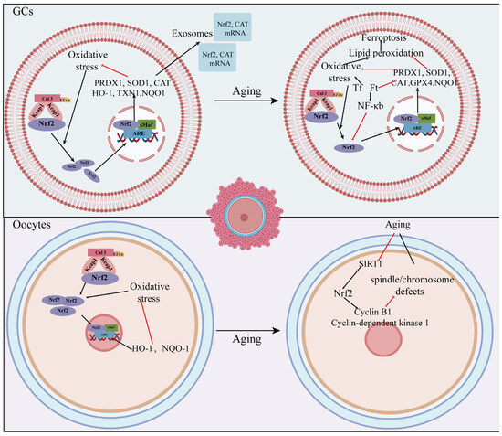 In summary, the Nrf2 expression level declines with age in both oocytes and granulosa cells and affects cellular function by influencing cellular oxidative stress and apoptosis, etc. (Figure 3). Furthermore, in the presence of oxidative stress, granulosa cells release exosomes that contain Nrf2-encoded mRNAs. These exosomes are then internalized via the surrounding granulosa cells to collectively defend against oxidative stress. However, it remains unclear whether there is intercellular communication between granulosa cells and oocytes in response to increased oxidative stress with increasing age. Further investigation is required to examine the potential association between granulosa cells and oocytes in the aging ovary via the Nrf2 signaling pathway.