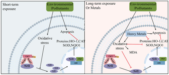 In brief, the underlying mechanisms of reproductive toxicity caused by various environmental pollutants involve oxidative stress and apoptosis (Figure 4). However, the expression of the Nrf2/Keap1 pathway has shown variability across different experimental studies. Based on this observation, we propose a hypothesis that the Nrf2/Keap1 pathway is initially activated as a defense against oxidative damage during the early stages of exposure to environmental pollutants. However, if the antioxidant system fails to properly remove excess ROS within the cell, it may result in a decrease in antioxidant enzyme activity and suppression of the Nrf2/Keap1 pathway. In addition, heavy metals may directly reduce antioxidant enzyme activity to damage cells. Moreover, gene knockdown and inhibitors have confirmed that Nrf2 is a protective factor against the reproductive toxicity of various pollutants.
