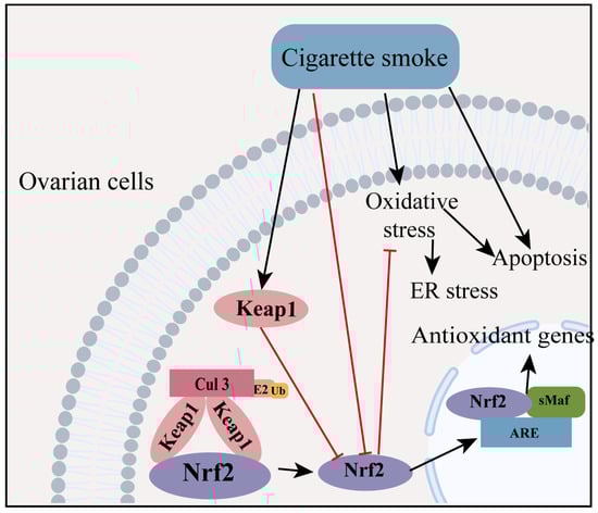 Above all, CSE induced oxidative stress via the Keap1/Nrf2 pathway in ovarian cells (Figure 5). More in-depth studies are needed to understand how CSE-mediated changes in the downstream and upstream signals of the Nrf2 pathway affect ovarian function. Further studies are necessary to verify whether the various components found in cigarettes have similar effects on the ovaries and to determine if there are other mechanisms at play in this process.