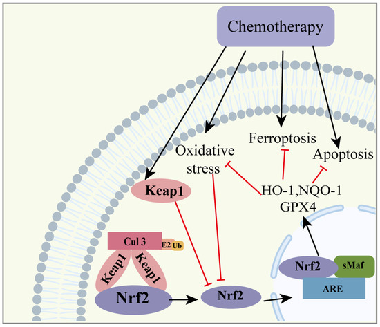 The role of the Nrf2 signaling pathway in chemotherapy-related ovarian aging. At the starting exposure to chemotherapeutic drugs, cells undergo an adaptive response that activates Nrf2 to produce antioxidant products to protect the cells. However, when the dose of chemotherapeutic drugs is increased or the exposure time is prolonged, the cellular defense response is unable to completely resist the toxicity of chemotherapeutic drugs, which eventually leads to cellular dysfunction. Some of the material in the image was sourced from BioRender.com, accessed on 24 July 2023. The red line represents inhibition and the black line represents promotion. heme oxygenase 1: HO-1; NADP (H) quinone dehydrogenase 1: NQO1; glutathione peroxidase 4: GPX4.