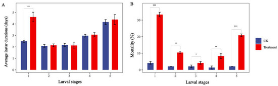 Thus, the larvae of S. exigua were treated with a higher dose (4.0 mg/mL) to study the effects of sub-lethal doses of nerolidol on different instar stages of S. exigua larvae. Compared to the control group, the treated larvae displayed a significantly prolonged development duration only during the 1st-instar stage (p < 0.01, Figure 1). However, the mortality rates at all instar stages were significantly increased (p < 0.05, Figure 1).