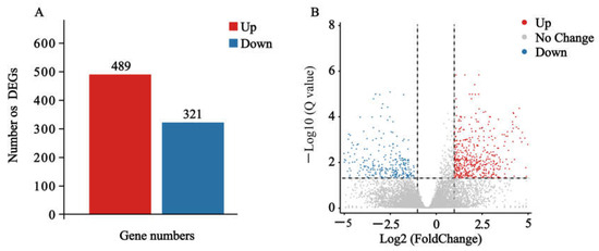 Analysis of differentially expressed genes (DEGs) in S. exigua larvae after nerolidol treatment. (A) Number of DEGs treated with nerolidol compared to the negative-control; (B) Volcano plot of DEGs identified in larvae.