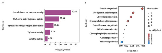 GO and KEGG analysis of JHE-family genes in S. exigua under nerolidol treatment. (A) The most significantly enriched GO term; (B) KEGG pathway enrichment.