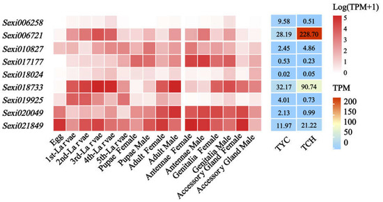 To determine the influence of nerolidol exposure on the expression of JHEs and JHELs, we investigated the expression profiles and responses of JHE-family genes to nerolidol. In total, nine JHEs or JEHLs were identified (Figure S2, Table S1), most of which had wide expression profiles (Figure 4), other than Sexi006258, which was consistent with their fundamental and essential roles in biological functions. Interestingly, several JHEs showed significant changes in expression levels in larvae when subjected to nerolidol compared to the control condition. Notably, Sexi006721 showed an 8.1-fold upregulation, whereas Sexi018773 exhibited a 2.8 fold upregulation, with both reaching relatively high levels of expression after nerolidol exposure. These findings suggested that nerolidol exposure had had a notable effect on the expression of certain JHE-family genes, potentially influencing their biological functions and regulatory roles in response to nerolidol.