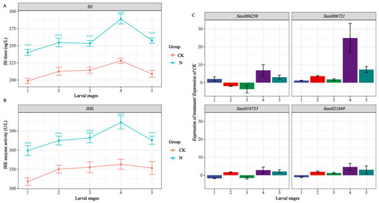 We further examined the potential effect of nerolidol on the activity of JHE, which is encoded by target genes in S. exigua larvae, together with JH titer, which is closely related to JHE activity. As shown in Figure 5A,B, JH titer and JHE activity in S. exigua larvae increased gradually with the progression of the instar stages, reaching their peaks during the 4th instar and subsequently declining during the 5th instar. Notably, when the larvae were treated with nerolidol, JHE activity and JH titer both increased significantly at each instar stage compared to what occurred in the control group (Mann–Whitney U-test, p < 0.001). Furthermore, as shown in Figure 5C, among the four JHEL genes analyzed, only Sexi006721 was upregulated during every age stage when subjected to the same dose of nerolidol. This indicated that this gene may respond to stress induced by nerolidol exposure, implying a significant role in the growth and development of S. exigua larvae.
