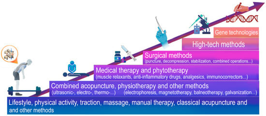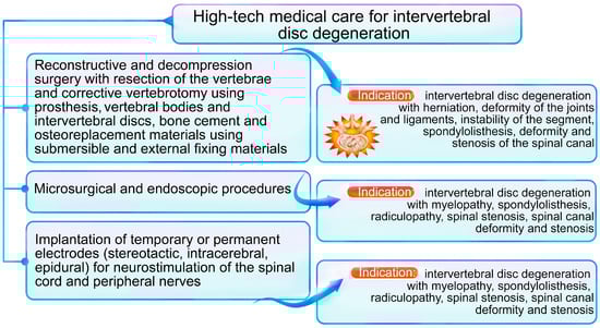High-tech medical care (HTMC) is a part of specialized care and includes the use of new and unique methods of treatment (resource-intensive, and as a rule, with proven effectiveness) []. HTMC can be provided for a number of profiles, including: vertebrology, traumatology, orthopedics, neurosurgery, etc. []. HTMC is used in a wide range of human diseases, which are characterized by complex mechanisms of pathogenesis and a progressive type of course, as well as when classical and new approaches to therapy are not effective enough or are not effective at all (Figure 1). Severe intervertebral disc degeneration (IDD) and the progressive type of IDD are indications for the use of high-tech therapies [] (Figure 2).