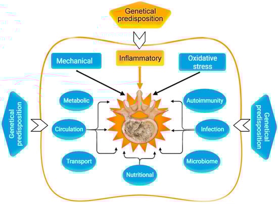 It is likely that IDD begins to develop in adolescence and progresses at a variable rate, leading to the formation of degenerative or traumatic herniated intervertebral discs (IVDs), chronic back pain, and disabling complications (spinal canal stenosis, spinal root compression, paresis, paralysis, etc.). The mechanisms of development and progression of IDD continue to be studied, but so far, there is no single point of view [] (Figure 3). In recent years, cytokine imbalance became considered as one of the important pathogenic mechanisms for IDD, which affects the risk of developing persistent vertebrogenic back pain, progressive apoptosis of chondrocytes, and other cells of the nucleus pulposus (NP) and fibrous ring (AF). Knowledge about the molecular mechanisms of acute and chronic inflammation and the role of these in degeneration of IVDs, based on a critical analysis of preclinical and clinical studies of the last decade, was presented by us in a previous publication [].
