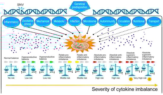 Possible variants of cytokine balance disorders in patients with intervertebral disk degeneration (IDD) []. Note: SNV—single-nucleotide variant; anti—anti-inflammation cytokines; pro—pro-inflammation cytokines; solid line—well-studied mechanisms of IDD; dotted line—insufficiently studied mechanisms of IDD; down arrow—decreased cytokine level; up arrow—increased cytokine level; and red exclamation point in a yellow hexagon—a dangerous situation.