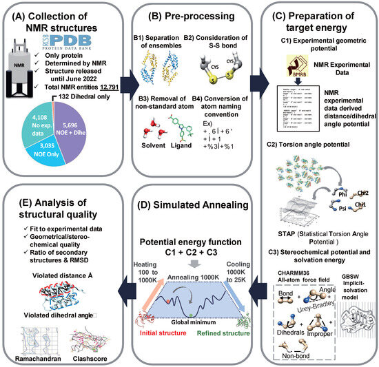 We developed a comprehensive NMR refinement protocol called TrioSA (torsion-angle and implicit-solvation-optimized simulated annealing), which was constructed in several steps (Figure 1). First, we acquired experimental NMR data from the Biological Magnetic Resonance Data Bank (BMRB) database [26] and obtained 8741 nuclear Overhauser effect (NOE) restraints. Second, we performed preprocessing steps on the protein structures obtained from the Protein Data Bank (PDB), including consideration of disulfide bonds, removal of non-standard atoms, and conversion from CHARMM PDB format to a format more suitable for analysis [22]. These preprocessing steps were necessary to ensure that the protein structures were in a consistent format and ready for further analysis using our TrioSA refinement protocol. Detailed information about these methods is explained in the Methods section and descriptions of the supplementary figures and tables can be found in Supplementary File S1.