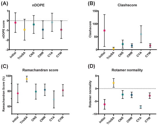 Our TrioSA-refined structure achieved the lowest nDOPE score (−0.95), outperforming CYW (−0.93), CNW (−0.93), CNS (−0.40), CYA (−0.18), and the original structures (−0.20) (Figure 2A). Explicit and implicit solvation models used in Refined, CNW, and CYW resulted in better scores than CNS and CYA without solvation models. Although CNW and CYW used explicit models, while our TrioSA refined structure used an implicit one, our score was still slightly better. In an ANOVA of the nDOPE scores of CNS, CNW, CYA, CYW, and TrioSA, a significant p value was obtained. However, when the analysis was conducted with only CNW, CYW, and TrioSA, no significant p value was observed (Supplementary File S6).